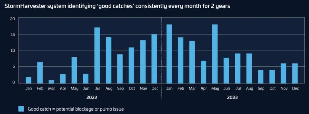 - StormHarvester detected over 60 early blockage formations in real time, at least 2 of which would have caused significant pollution incidents (CAT 3 or worse) if it was not for these alerts.