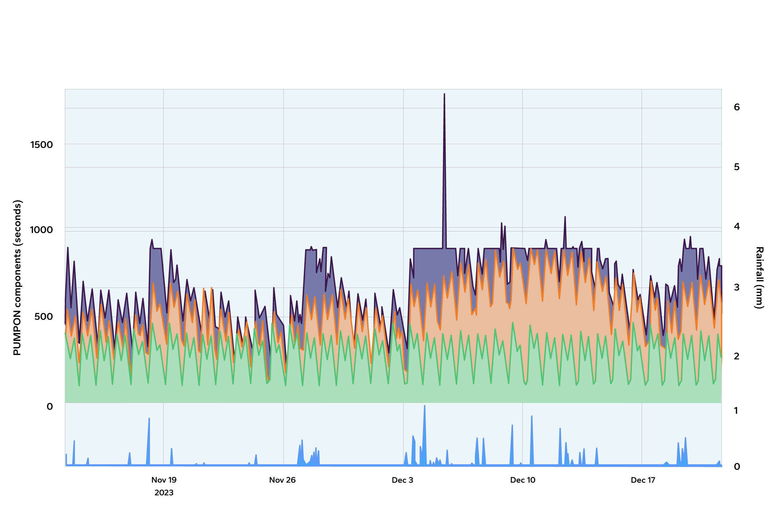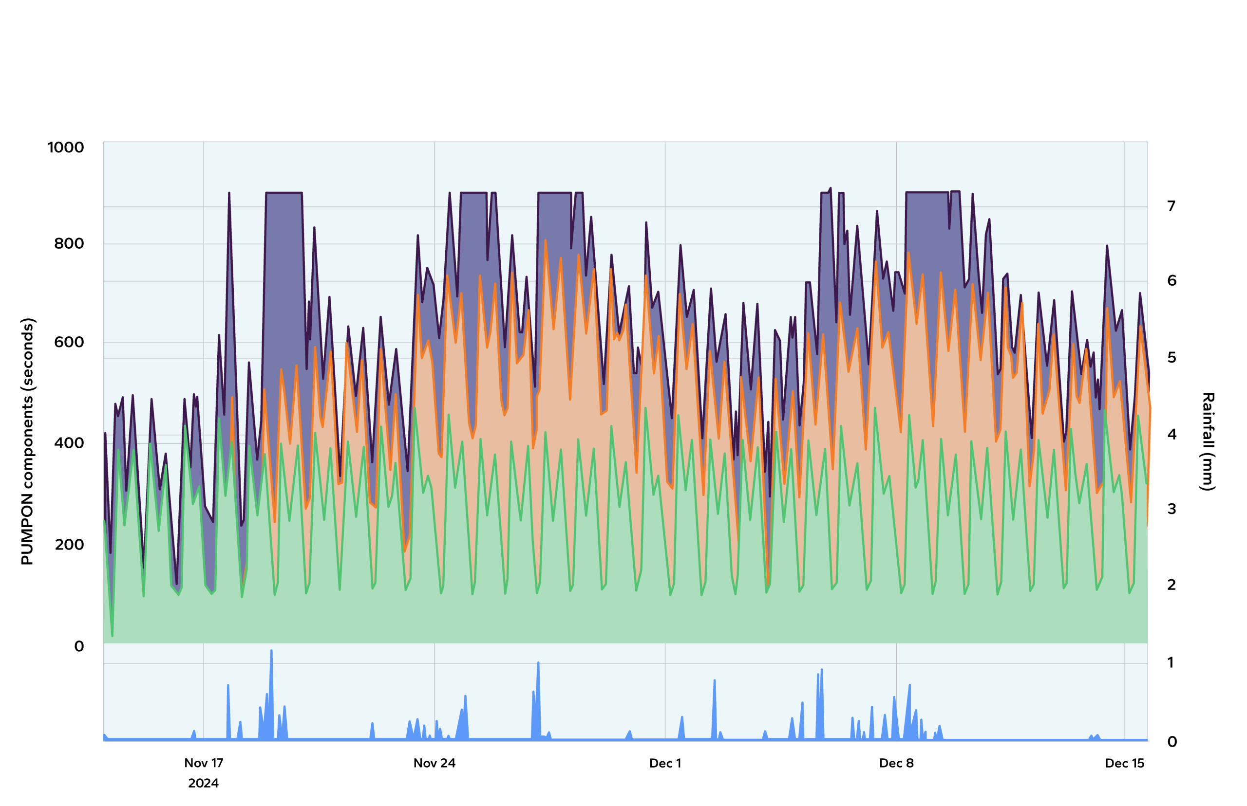 Image shows: Image shows the breakdown of time the pumps ran the following winter after mitigation actions were taken by Anglian Water. The total pump run time is almost 600 hours less.